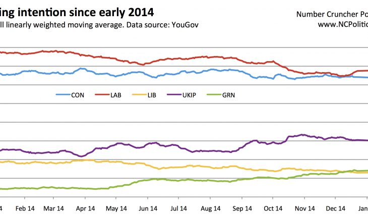 (1) 2014 saw Labour and the Lib Dems lose vote share while UKIP and the Greens gained, particularly around the time of the European elections in May, which UKIP won (see next chart). The Conservative vote share was broadly unchanged, leaving the Tories very close to Labour by the end of the year.